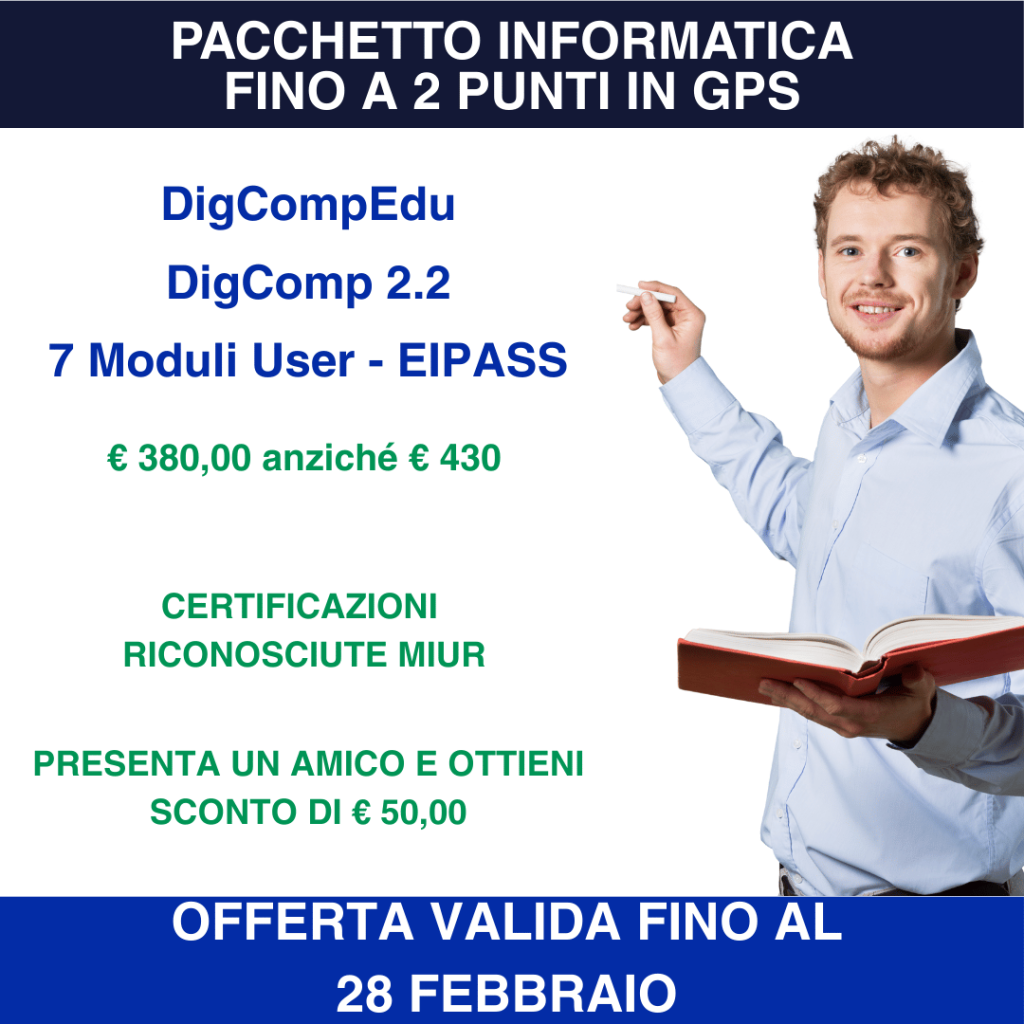 Titolo di studio (obbligatorio): Laurea magistraleLaurea triennaleLaurea specialisticaDiploma ITPLaurea vecchio ordinamentoDiploma magistraleDiploma di maturità Offerta formativa (obbligatorio): Formazione DocentiFormazione ATAeCampusFormazione Aziendale Corso (obbligatorio): MASTER L2CLIL30 CFU ex art.13INDIRE Percorso OrdinarioINDIRE Percorso Titolo EsteroCertificazione Inglese A1Certificazione Inglese A2Certificazione Inglese B1Certificazione Inglese B2Certificazione Inglese C1Certificazione Inglese C2Certificazione IngleseSpecializzazione Sostegno per LaureatiAlfabetizzazione DIGITALE CIADSpecializzazione sostegno ITP - Diplomati magistraleDigital Pack - 4 certificazioni informaticheCERTIFICAZIONE INFORMATICA Digital CompetenceLIMTABLETCODINGCanva EDUDSA - BESPERCORSO ABILITANTE 60 CFUIO Cittadino DigitaleCAD 3DCERTIFICAZIONE INFORMATICA PEKIT EXPERTCLIL LINGUA INGLESEMASTER ANNUALE 60 CFUMASTER BIENNALE 120 CFUCorso di Perfezionamento per diplomati 60 CFUDattilografiaCORSO OSACORSO OACCorso di laurea TRIENNALECorso di laurea MAGISTRALEESAME SINGOLOPERCORSO ABILITANTE 30 CFUPERCORSO ABILITANTE 36 CFUCLIL RefreshAltro